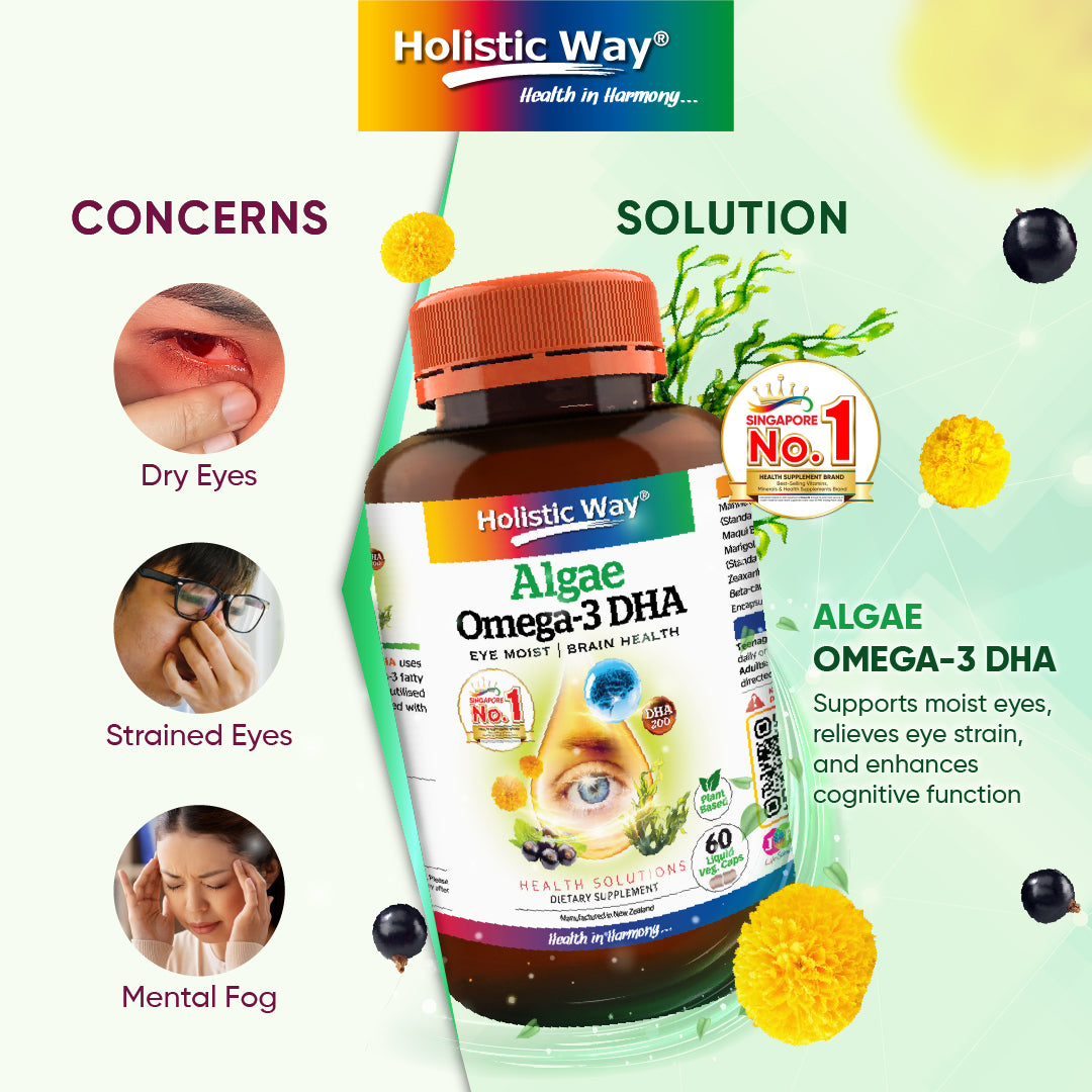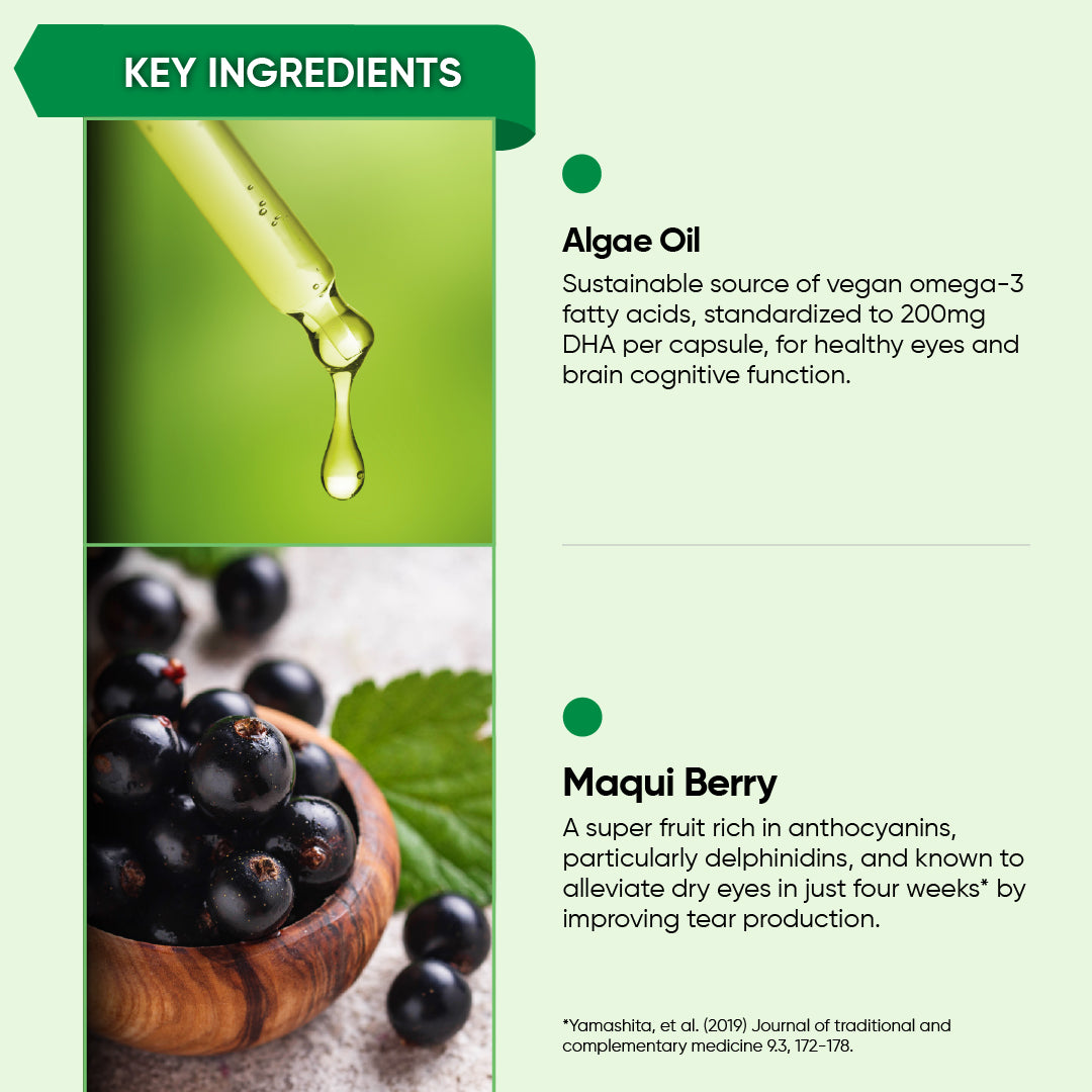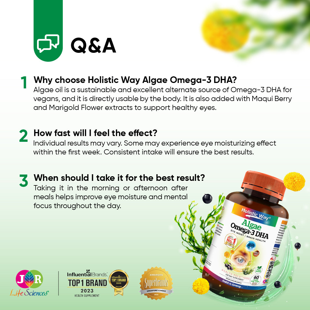 Holistic Way Algae Omega-3 DHA uses marine algae oil to offer a sustainable, vegan source of omega-3 fatty acids, providing 200 mg of DHA per capsule. Algae DHA is better utilised by the body and is suitable for vegetarians and vegans. Enhanced with maqui berries, lutein, beta-carotene, and zeaxanthin, it helps to: