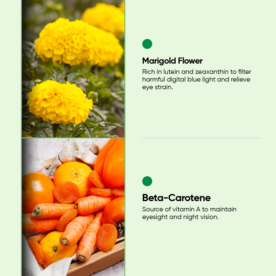 - Marigold (Tagetes erecta) Flower Oil Extract – 33.34 mg (Standardized to 15% Lutein 5 mg)