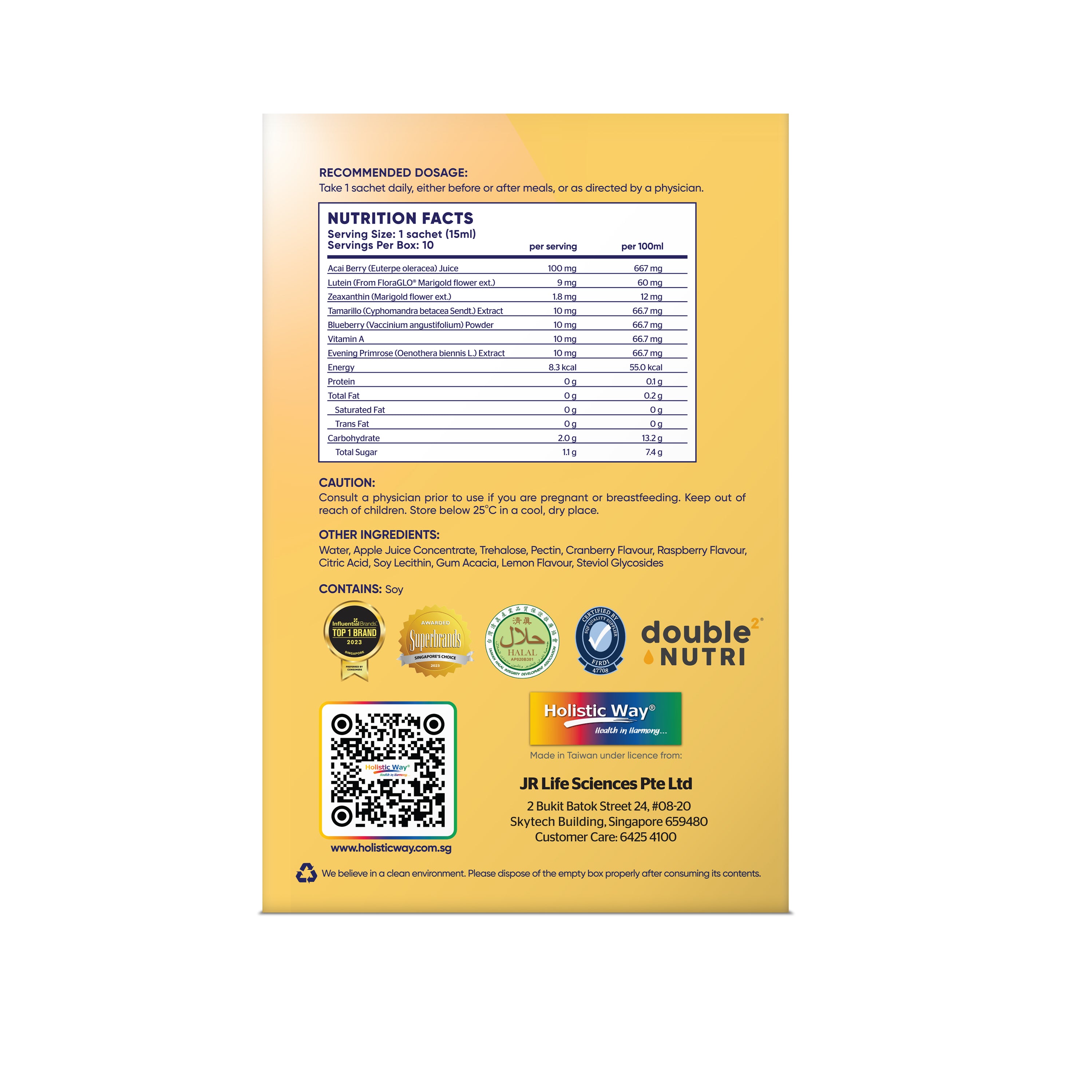 Holistic Way Bio-Elixir Super Vision Pro Shot is a comprehensive ALL-in-One formula comprising active ingredients of Lutein, Zeaxanthin, Acai Berry, Blueberry, Tamarillo, and Vitamin A to support healthy eyes and the immune system.