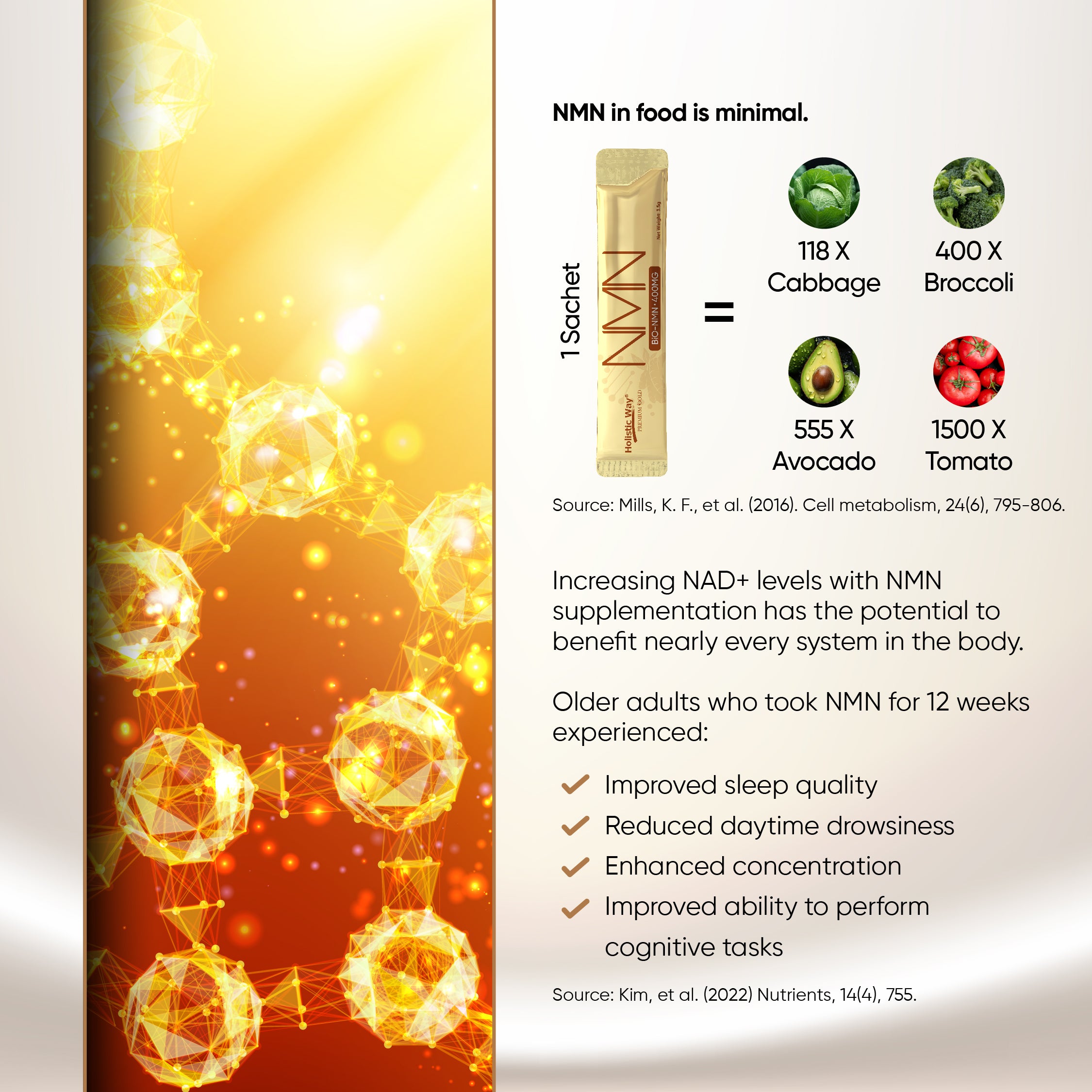 NAD+, a cellular energiser, declines with age, making our bodies more susceptible to environmental stress. Holistic Way Bio-NMN 400mg increases NAD+ levels in the body and supports healthy cells and ageing. Combined with PQQ, Coenzyme Q10, and curcumin, it helps to enhance energy production, improve cellular function, and promote overall well-being. Embrace a healthier and more energetic life with Holistic Way Bio-NMN 400mg.