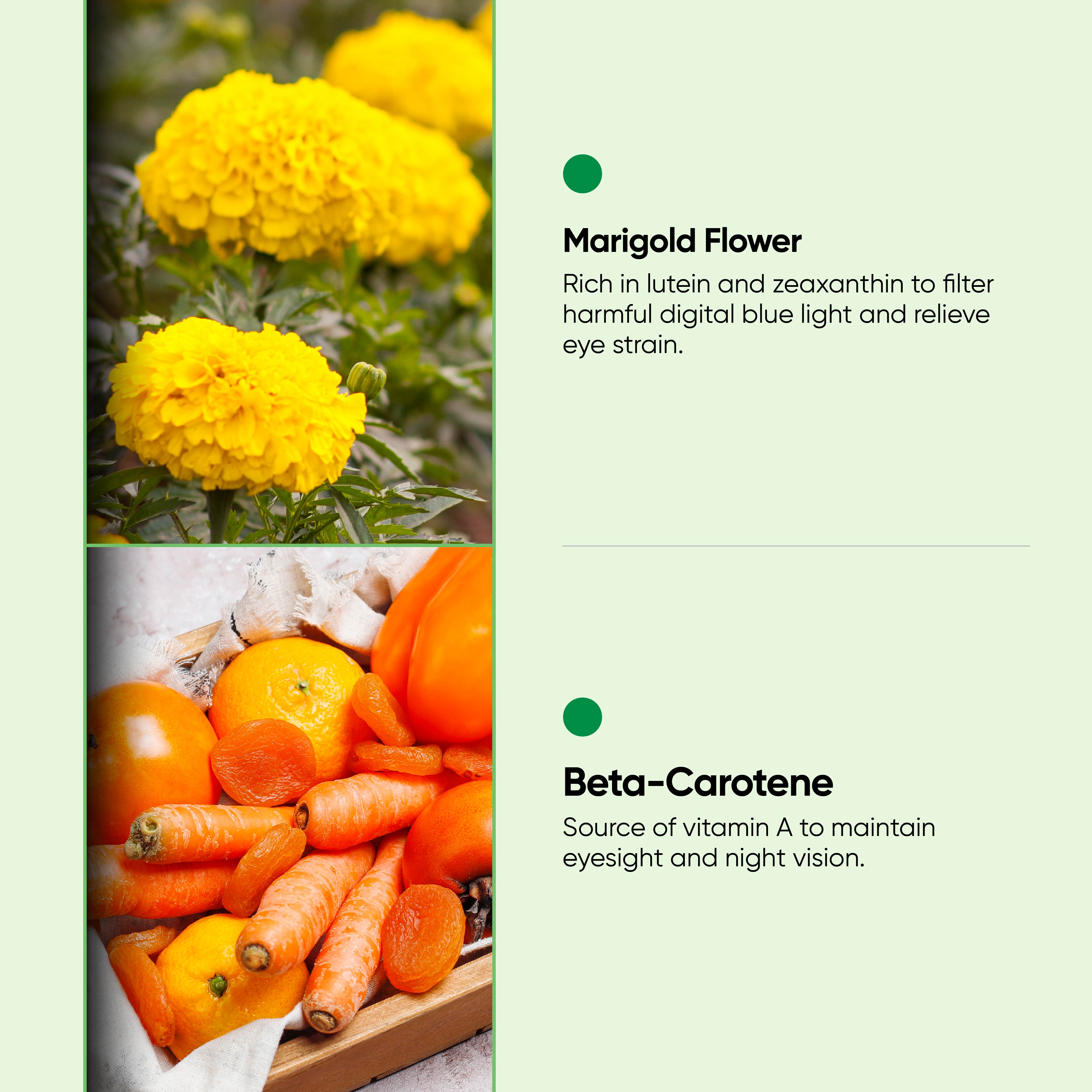 - Marigold (Tagetes erecta) Flower Oil Extract – 33.34 mg (Standardized to 15% Lutein 5 mg)
