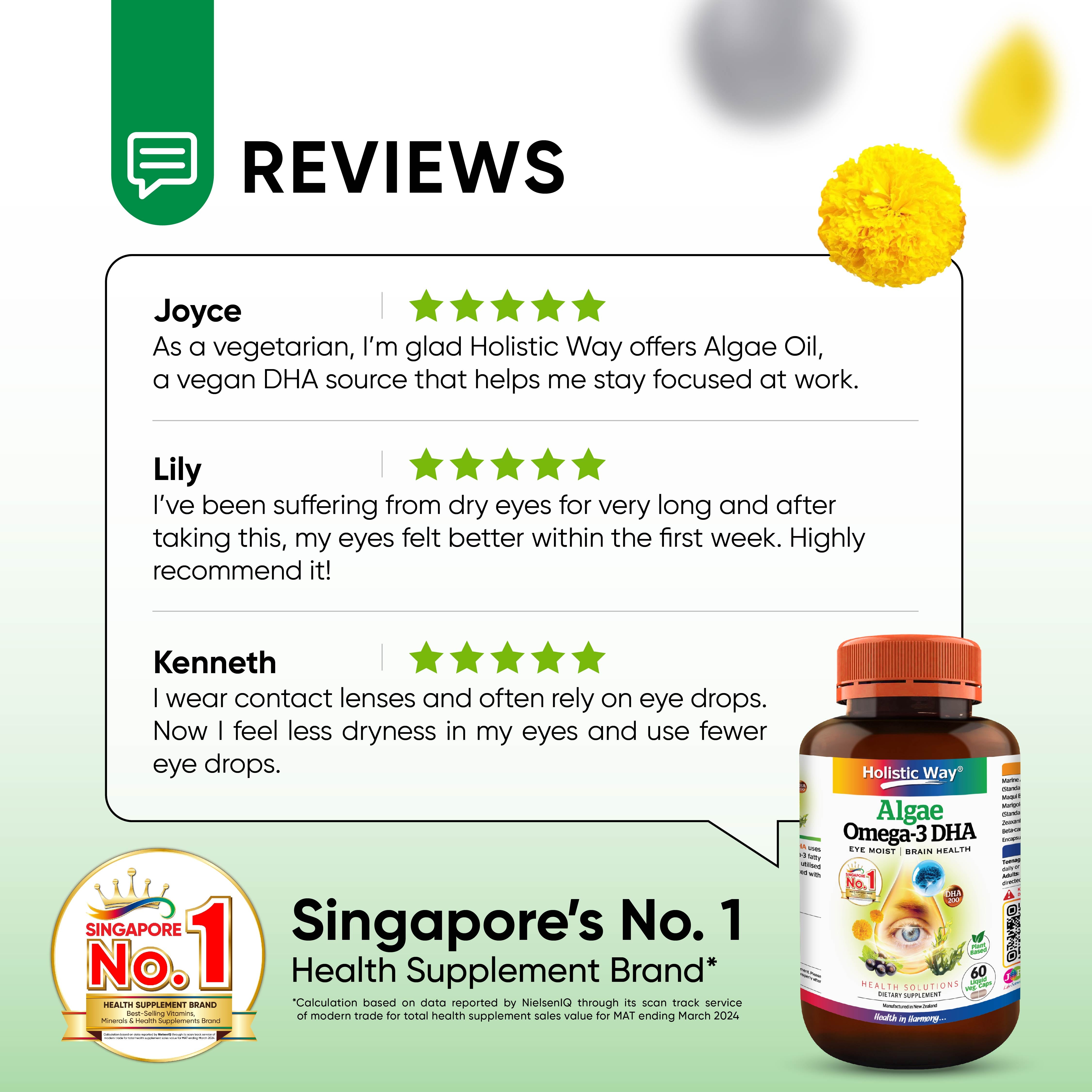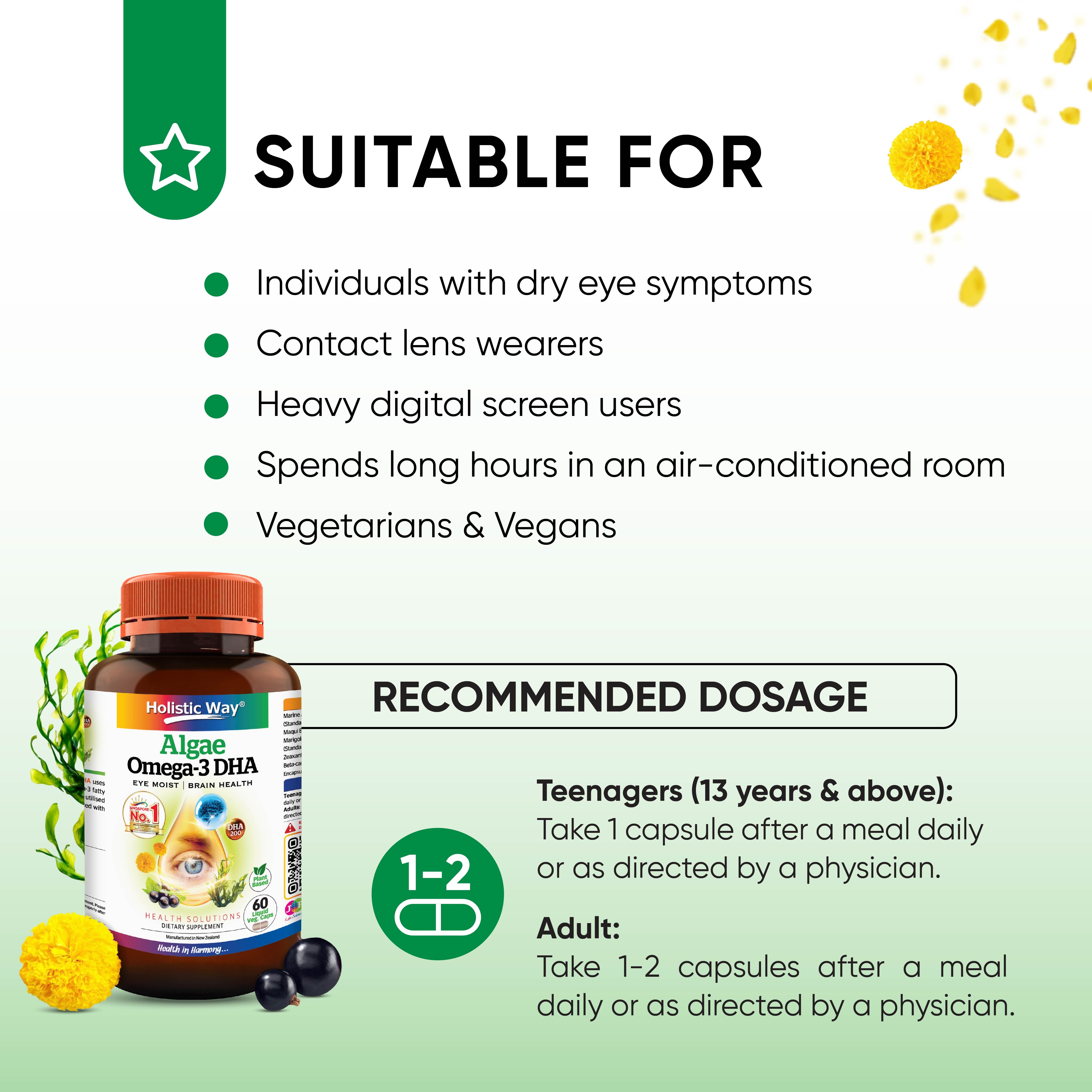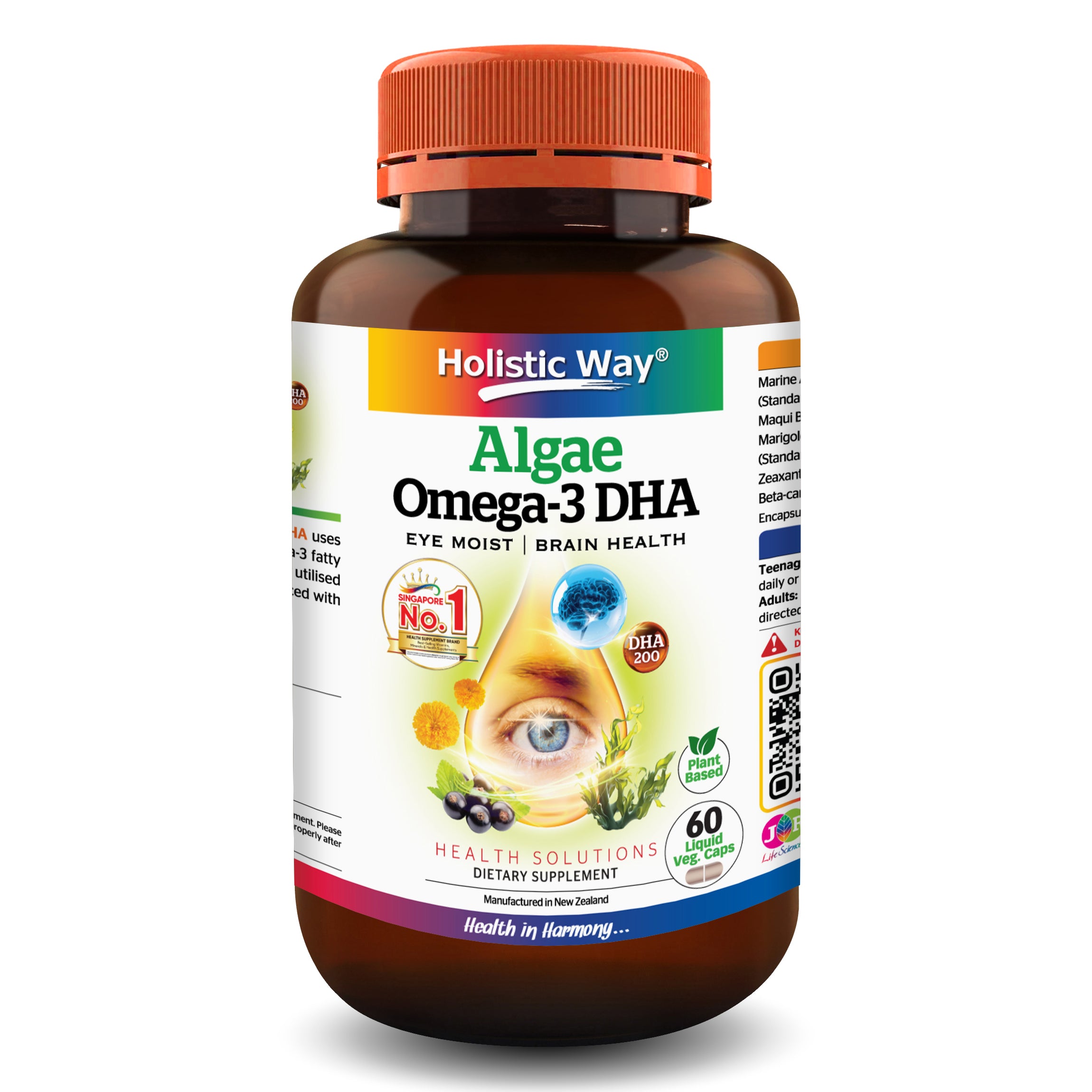 Holistic Way Algae Omega-3 DHA uses marine algae oil to offer a sustainable, vegan source of omega-3 fatty acids, providing 200 mg of DHA per capsule. Algae DHA is better utilised by the body and is suitable for vegetarians and vegans. Enhanced with maqui berries, lutein, beta-carotene, and zeaxanthin, it helps to: