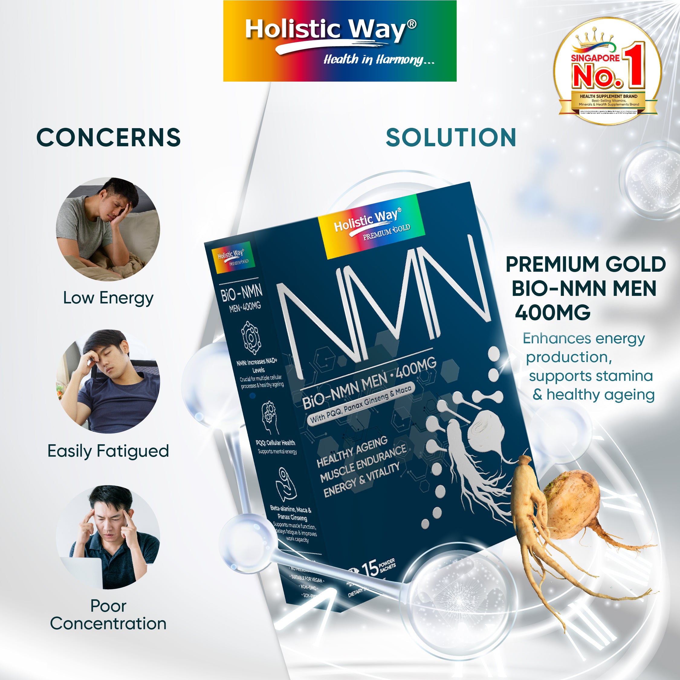 NAD+, a cellular energiser, declines with age, making our bodies more susceptible to environmental stress. Holistic Way Bio-NMN Men 400mg increases NAD+ levels in the body and supports healthy cells and ageing. Enhanced with patented Beta-alanine, it can support muscle endurance and delay fatigue. PQQ, Panax Ginseng and Maca Extracts are also included to improve stamina, mental clarity, and work capacity. Experience renewed vitality and overall well-being with Holistic Way Bio-NMN Men.