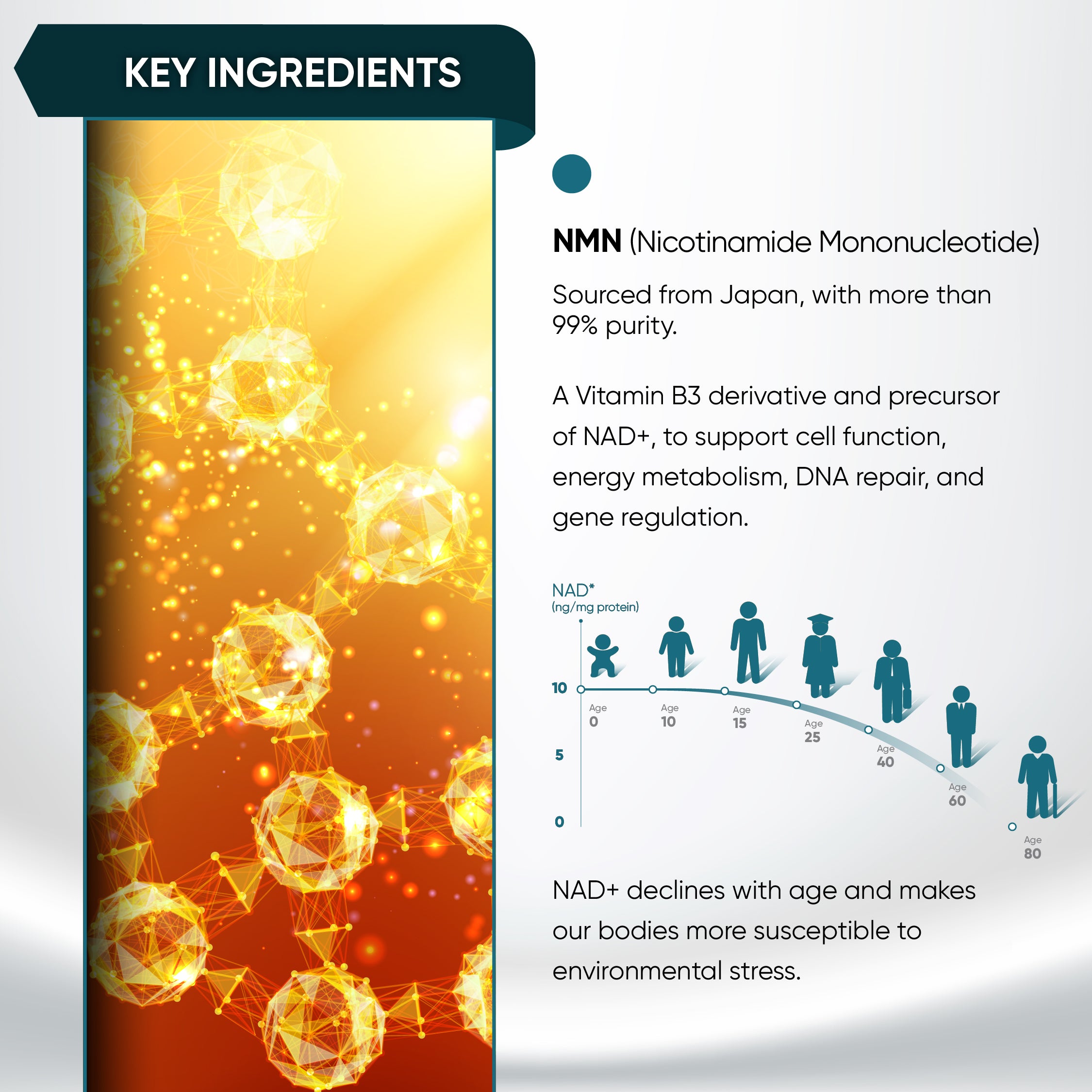 A precursor of NAD+, to support cell function, energy metabolism, DNA repair, and gene regulation.