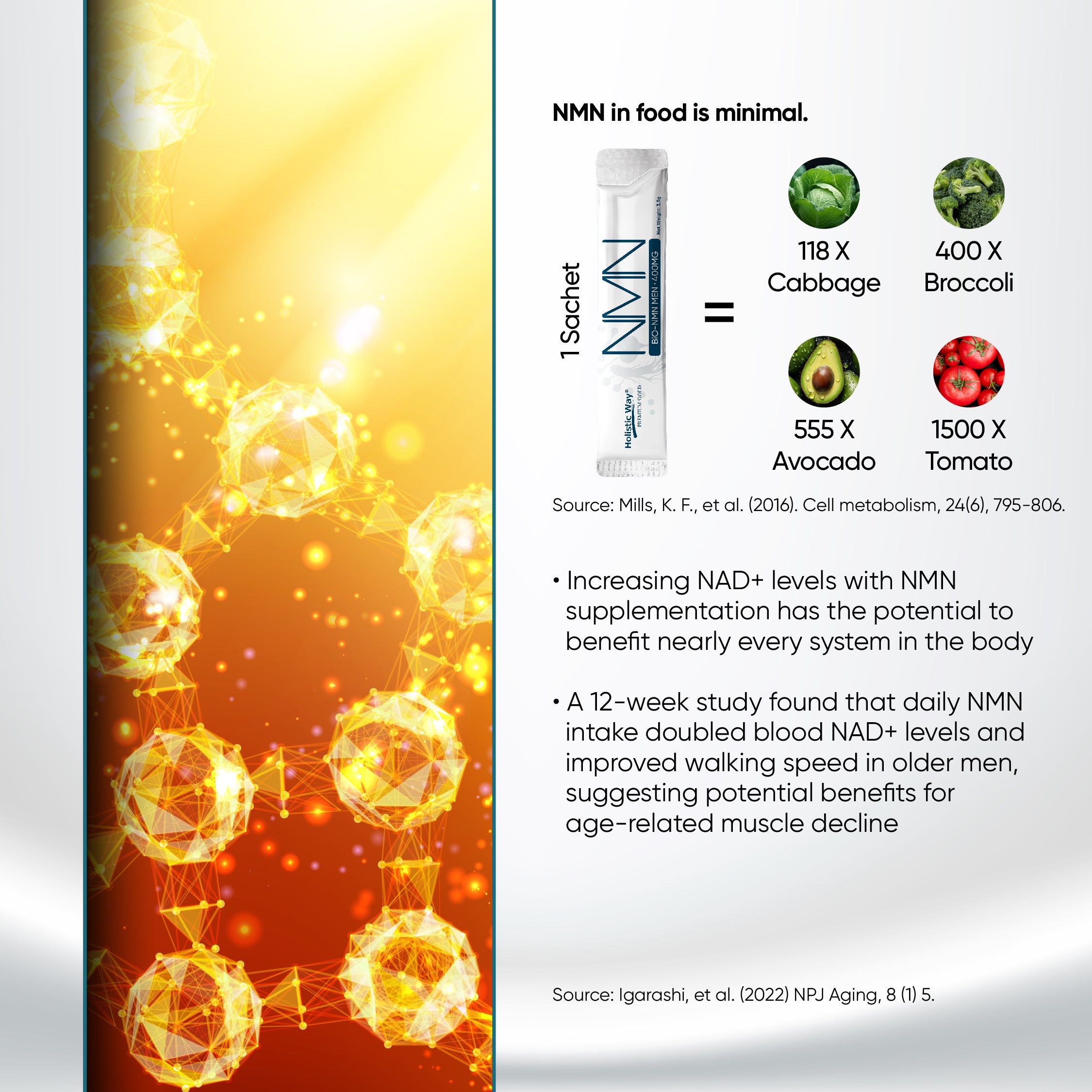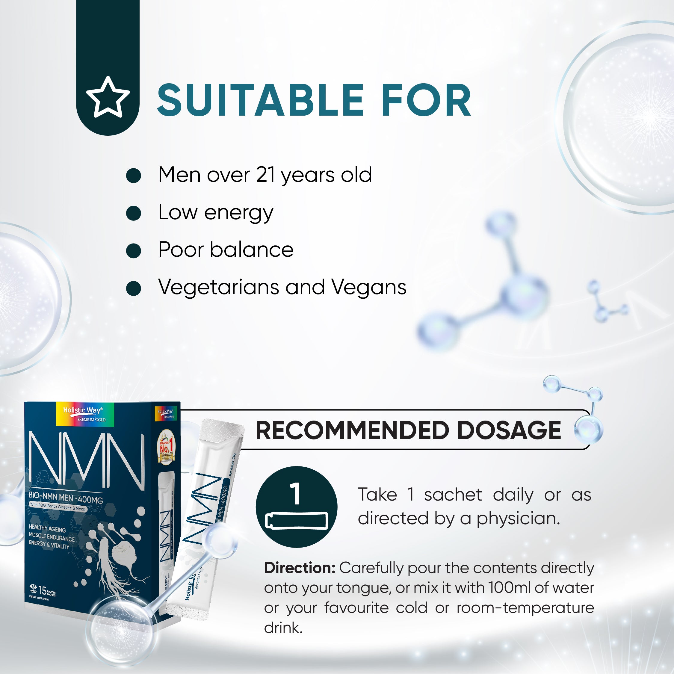 Each sachet delivers 400mg of high-purity NMN, sourced from Japan (≥99%), enhanced with Beta-Alanine, PQQ, Panax Ginseng, and Maca for performance, clarity & vitality.