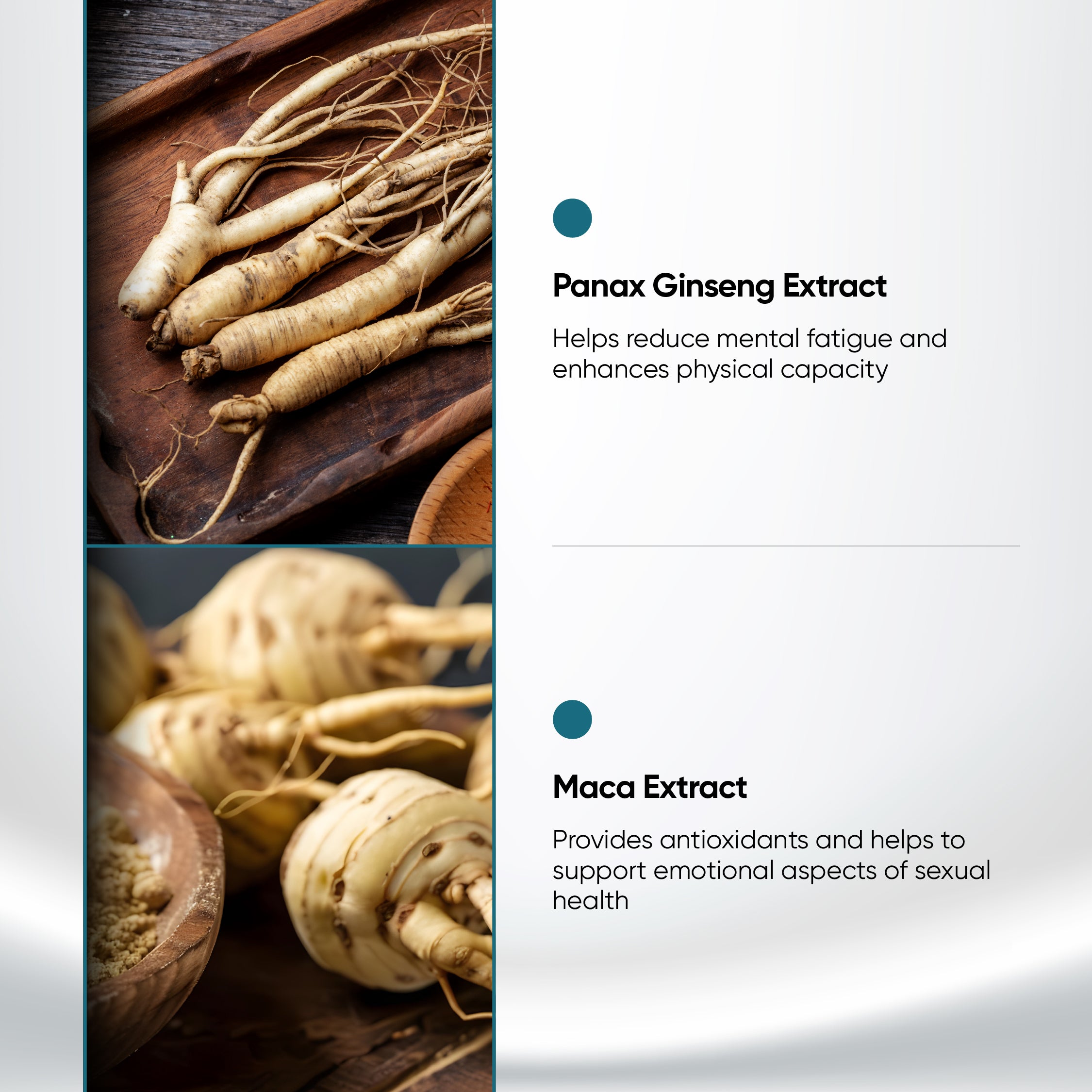 - Maca (Lepidium Meyenii Walp) Root Extract – 50mg