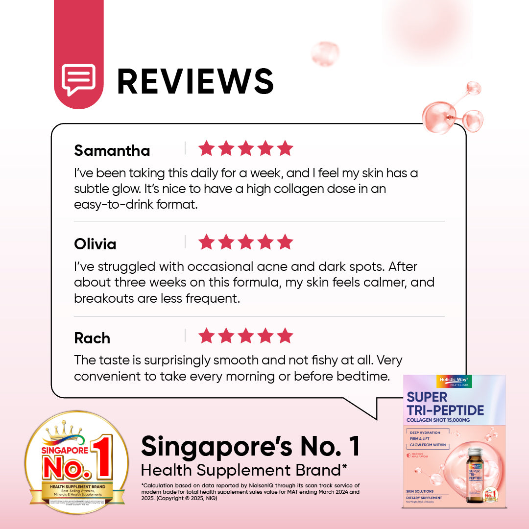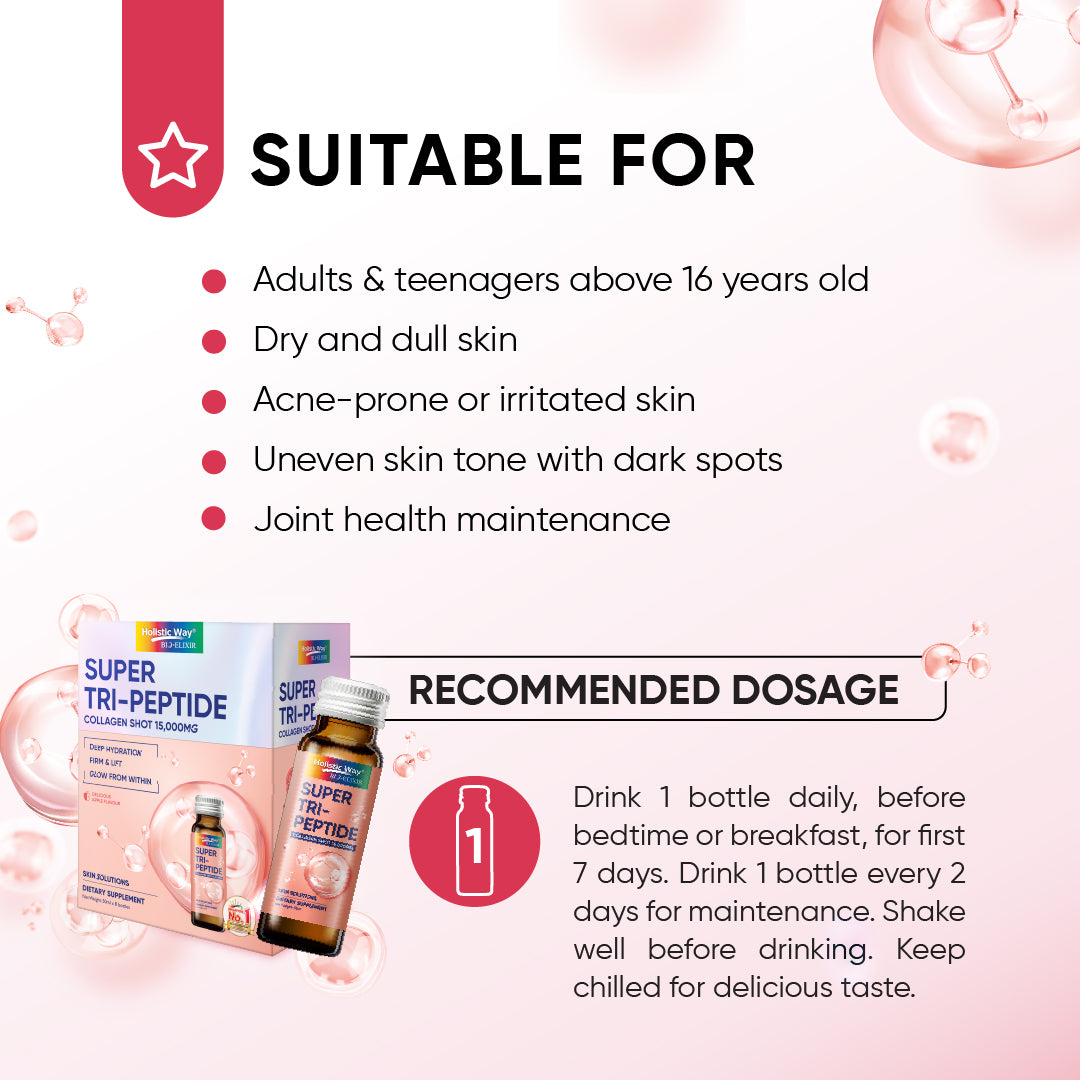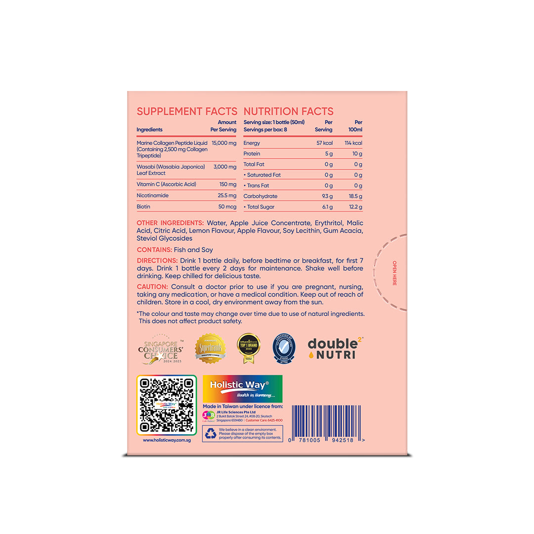 Holistic Way Bio-Elixir Super Tri-Peptide Collagen Shot 15,000 mg is crafted using a unique hydrolysis process that produces collagen tripeptides with a molecular weight of less than 500 Dalton, enabling direct absorption by the body without the need for digestion. These smaller peptides offer 4.8 times better absorption than regular collagen peptides. Featuring seven types of functional collagen, it supports skin hydration, healthy joint cartilage, and normal muscle function. Enhanced with antioxidant-rich wasabi leaf extract, it helps lighten dark spots and improve skin moisture. Suitable for both men and women, it promotes youthful, glowing skin in just 7 days*. This product utilizes Double Nutri®, a patented technology that enhances ingredient absorption in the body.