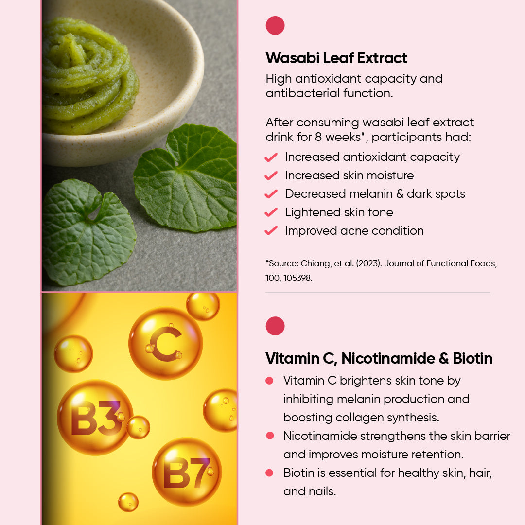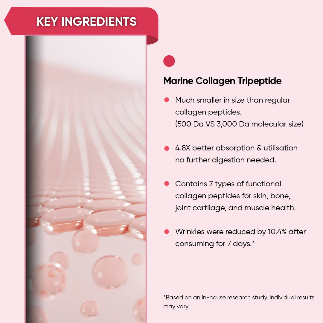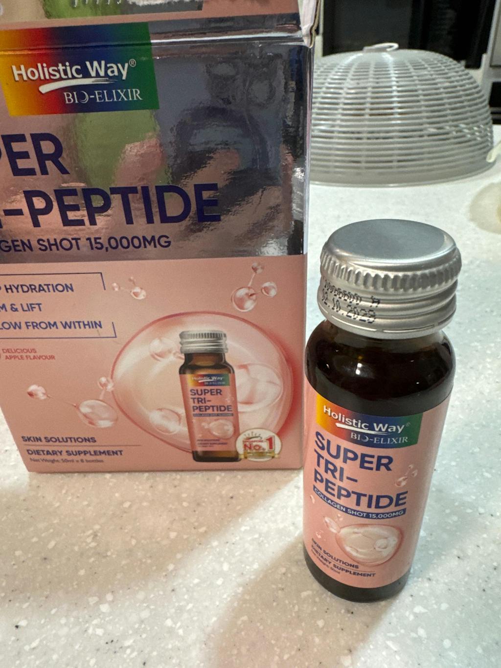 Holistic Way Bio-Elixir Super Tri-Peptide Collagen Shot 15,000 mg is crafted using a unique hydrolysis process that produces collagen tripeptides with a molecular weight of less than 500 Dalton, enabling direct absorption by the body without the need for digestion. These smaller peptides offer 4.8 times better absorption than regular collagen peptides. Featuring seven types of functional collagen, it supports skin hydration, healthy joint cartilage, and normal muscle function. Enhanced with antioxidant-rich wasabi leaf extract, it helps lighten dark spots and improve skin moisture. Suitable for both men and women, it promotes youthful, glowing skin in just 7 days*. This product utilizes Double Nutri®, a patented technology that enhances ingredient absorption in the body.