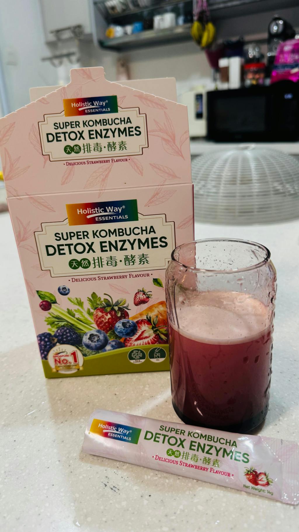 Holistic Way Essentials Super Kombucha Detox Enzymes is a fermented drink with refreshing strawberry flavour. It is made from the symbiotic bacteria and yeasts from black tea, which are fermented to produce a unique sweet and sour taste. Formulated with probiotics and 14 different types of fruit and vegetable enzymes, this low-calorie beverage helps remove unwanted waste from the body, burns excess fat, and replenishes our body with good bacteria and nutrients. Prebiotic is also added to promote growth of good bacteria in the gut, while indigestible dextrin, a type of dietary fibre, is added to help promote feeling of fullness and reduce calorie intake. This product is suitable for individuals who enjoy indulging in heavy and salty meals, supporting a cleansed and revitalised gut.