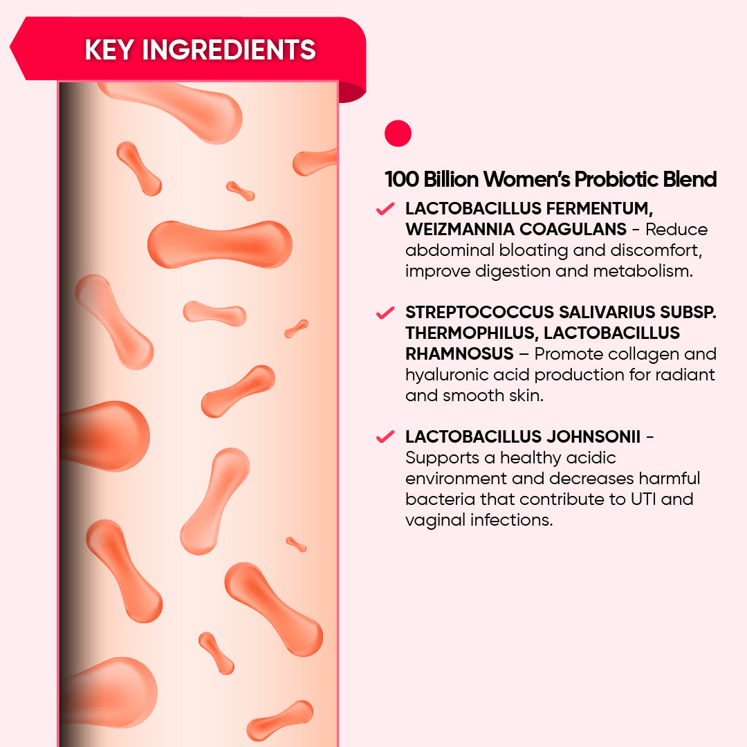 - Women Probiotic Blend - 100 Billion CFU (Lactobacillus fermentum, Streptococcus salivarius subsp. thermophilus, Weizmannia coagulans, Lactobacillus johnsonii, Lactobacillus rhamnosus), Inulin (Prebiotic) - 643 mg