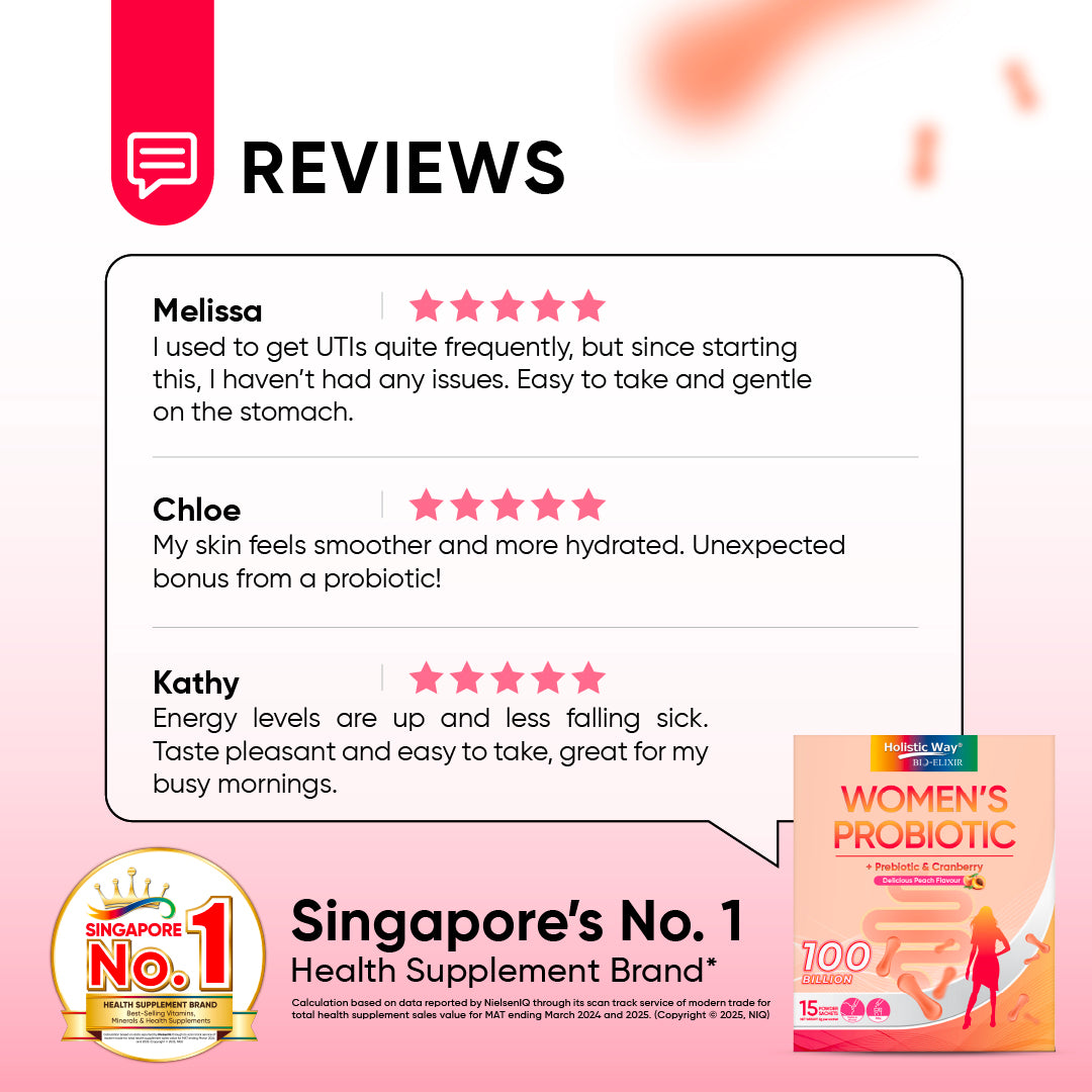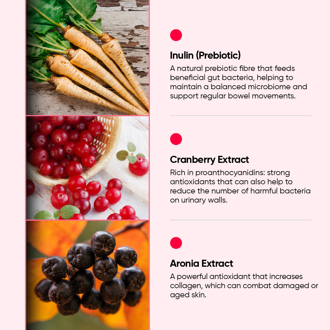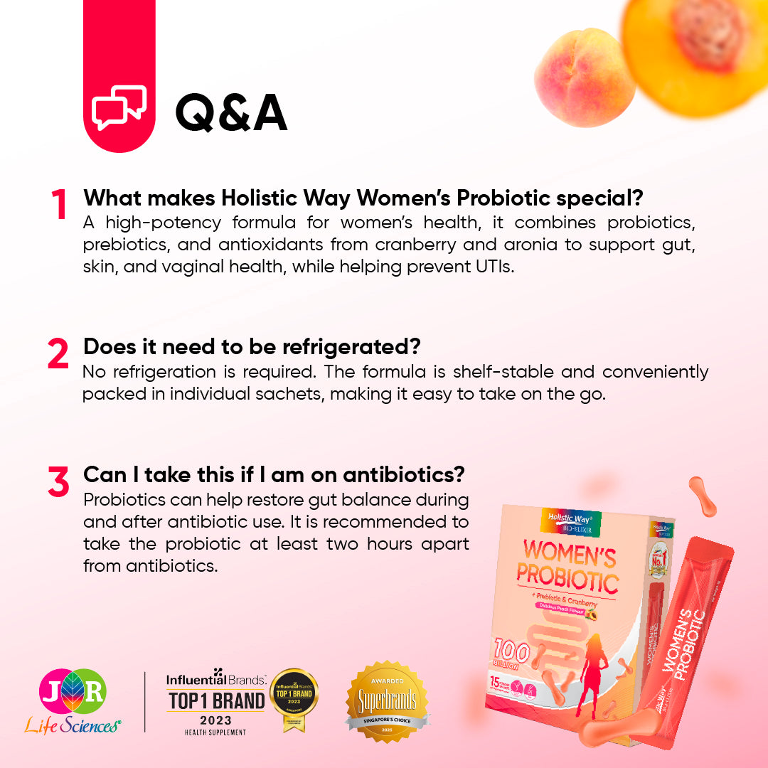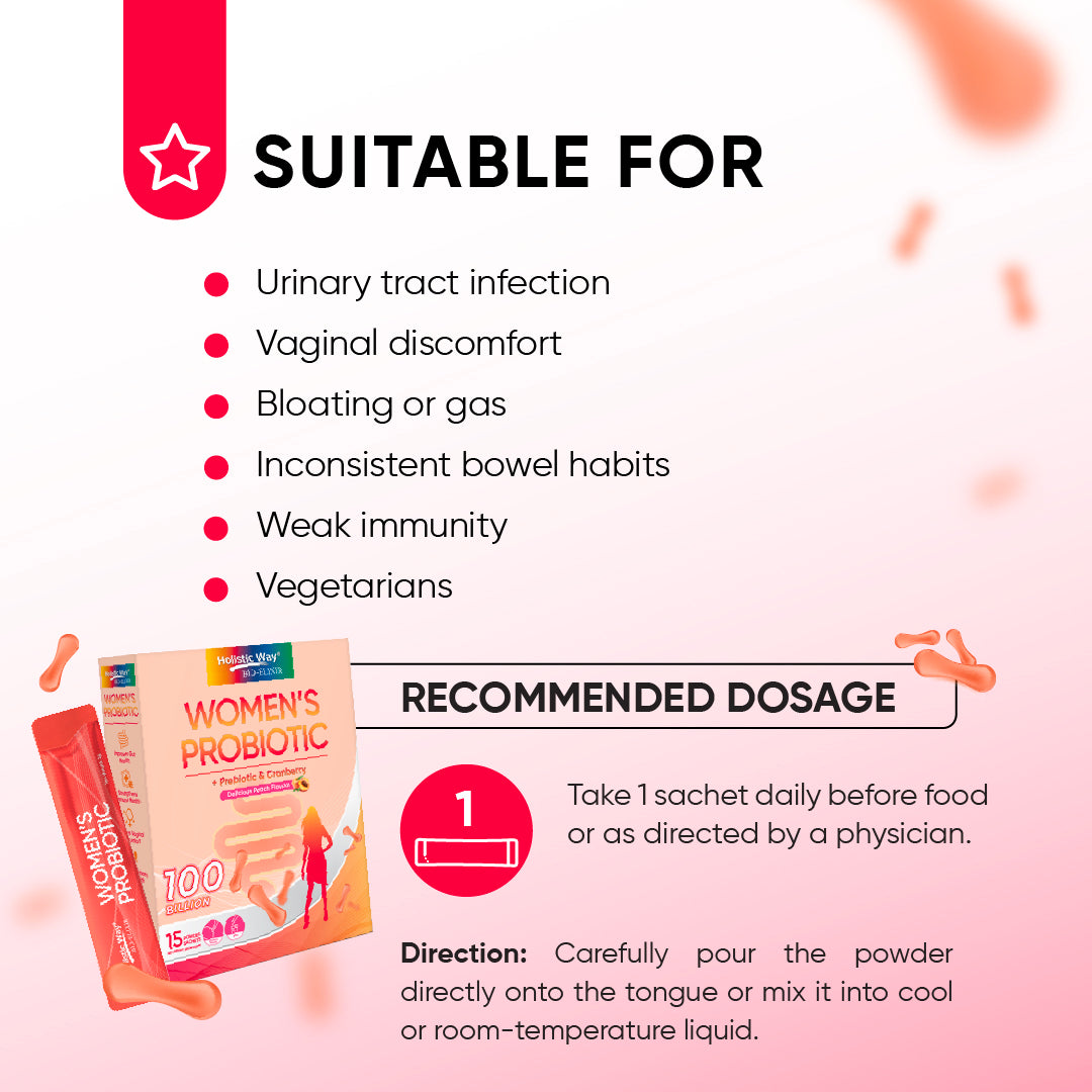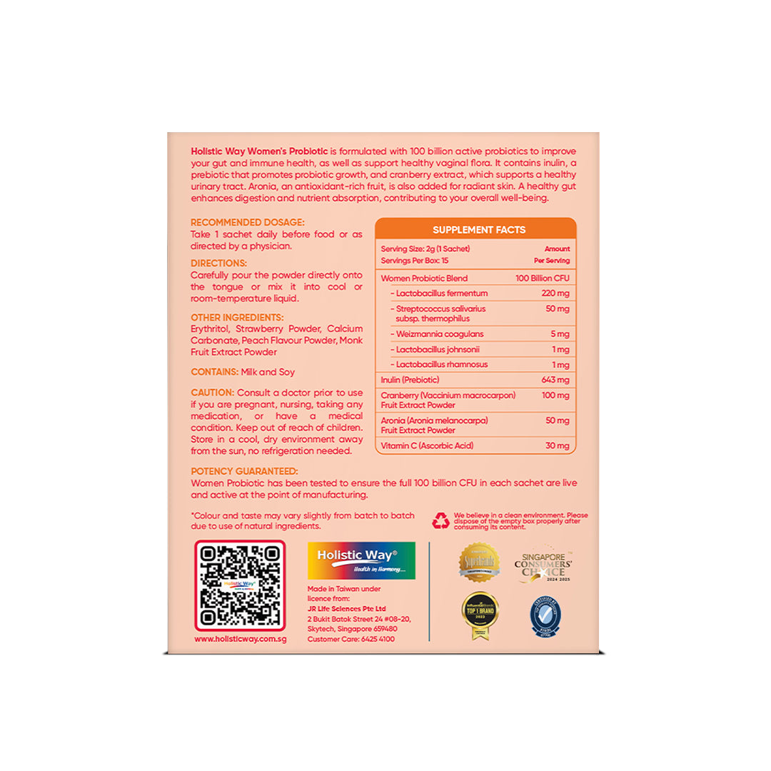 Holistic Way Women’s Probiotic is formulated with 100 billion active probiotics to improve your gut and immune health, as well as support healthy vaginal flora. It contains inulin, a prebiotic that promotes probiotic growth, and cranberry extract, which supports a healthy urinary tract. Aronia, an antioxidant-rich fruit, is also added for radiant skin. A healthy gut enhances digestion and nutrient absorption, contributing to your overall well-being.