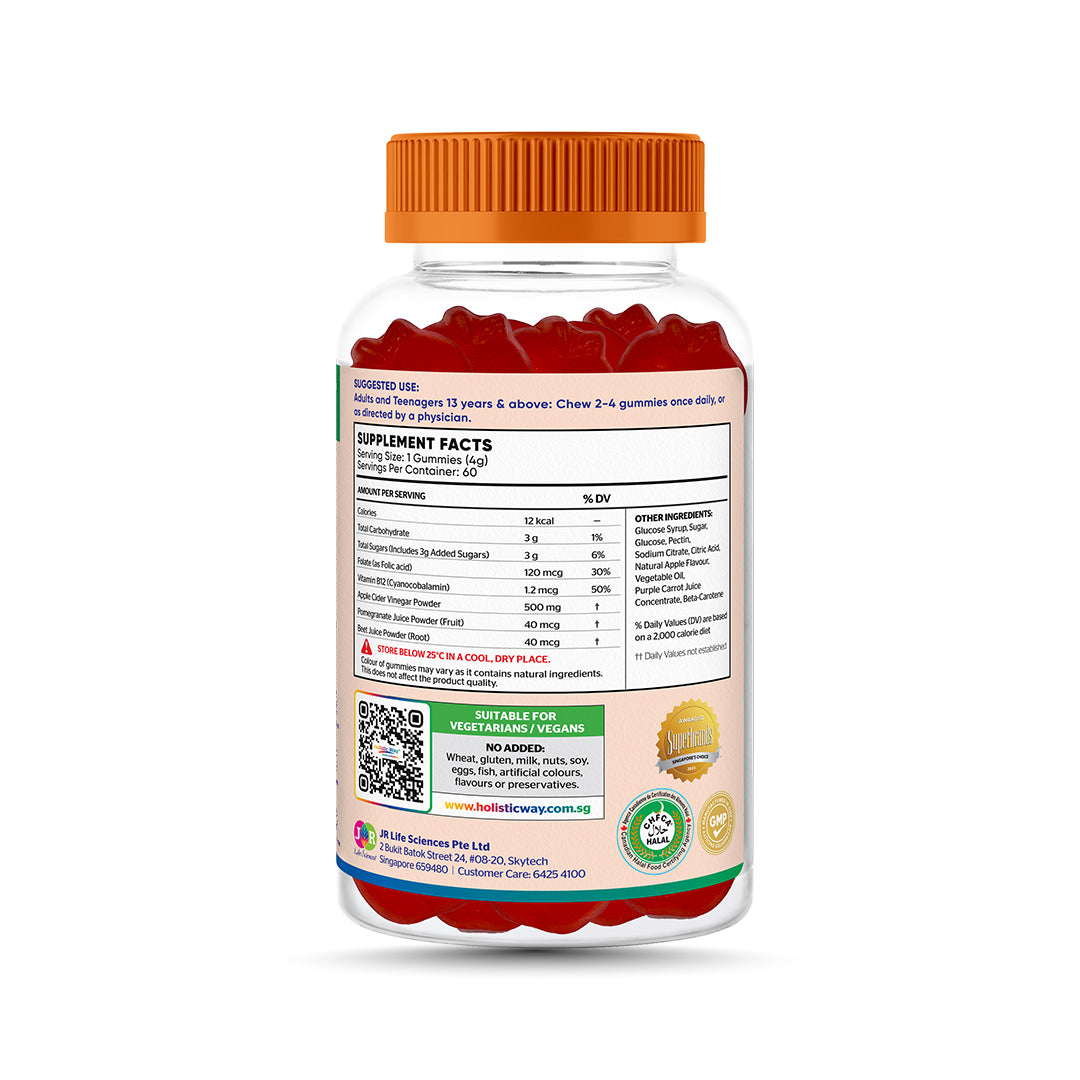 Holistic Way Apple Cider Vinegar Gummy is a dietary supplement that contains concentrated apple cider vinegar, beetroot, and pomegranate. This unique combination is designed to support healthy weight, metabolism, and digestion.