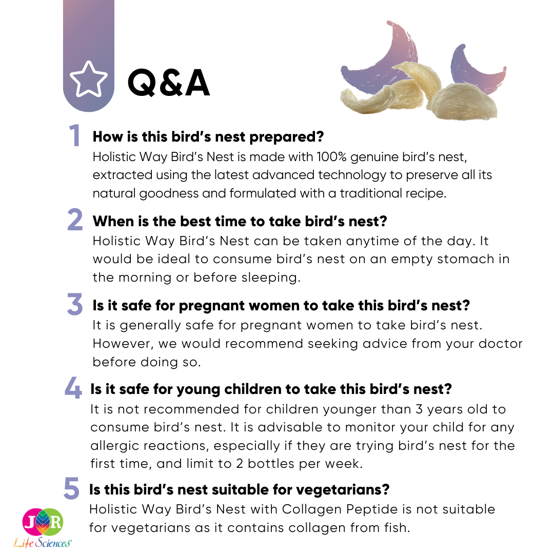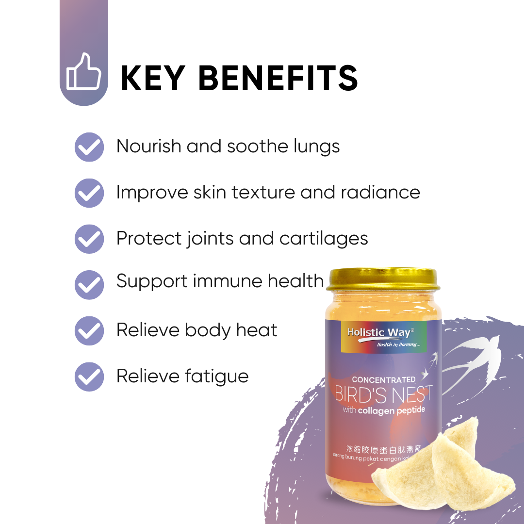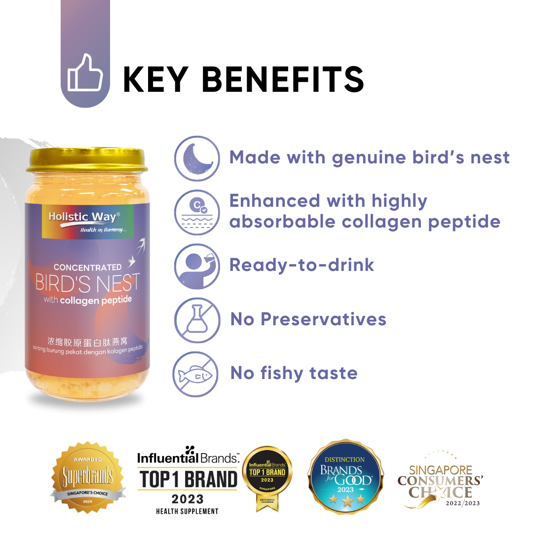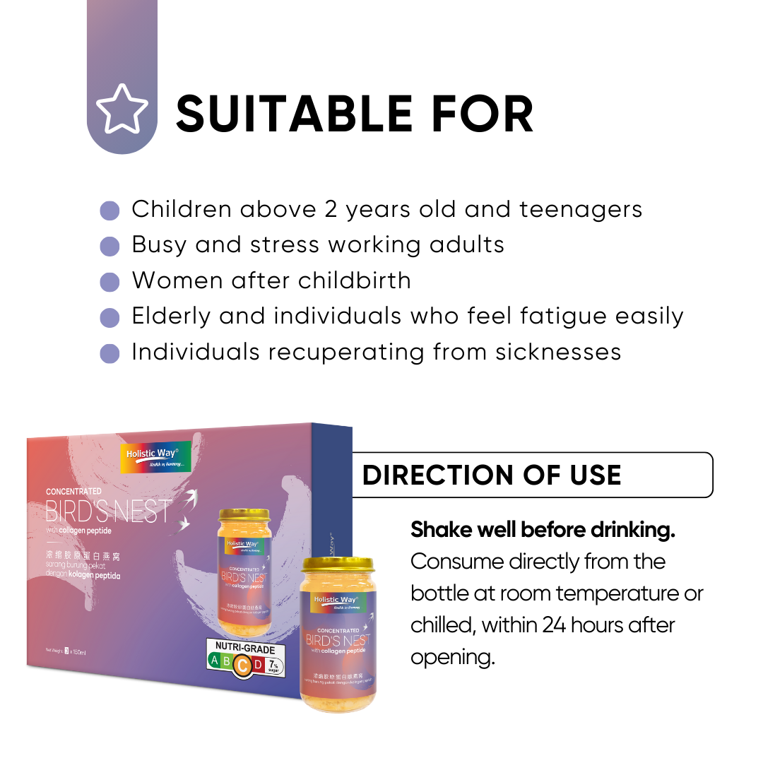 Holistic Way Concentrated Bird’s Nest with Collagen Peptide is made with genuine bird’s nest and highly absorbable collagen peptide. This traditional recipe is prepared using the latest advanced technology to preserve all the natural goodness in a concentrated blend. It is suitable for all generations, nourishing the body and promoting skin radiance.