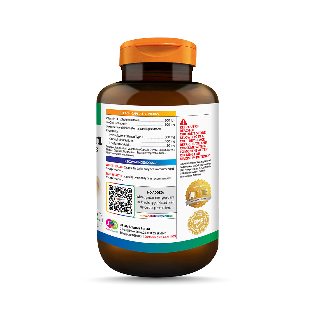 Holistic Way High Strength Joint Collagen is specially comprised of BioCell Collagen® and Vitamin D3. This highly bioavailable combination may play an essential role towards the health of cartilage, synovial fluid, tendon, ligament and skin. BioCell Collagen® is made up of hormone and antibiotic free chicken sternal cartilage. It mirrors human articular cartilage and contains a patented composition of naturally occurring