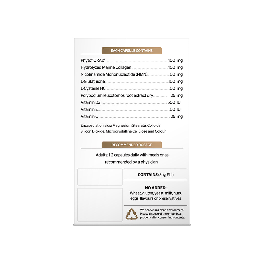 The comprehensive formulation also consists of Nicotinamide Mononucleotide (NMN), a cellular energy precursor and various antioxidants that may assist in energy metabolism and overall skin health. Suitable for both men and women to support skin integrity from within.