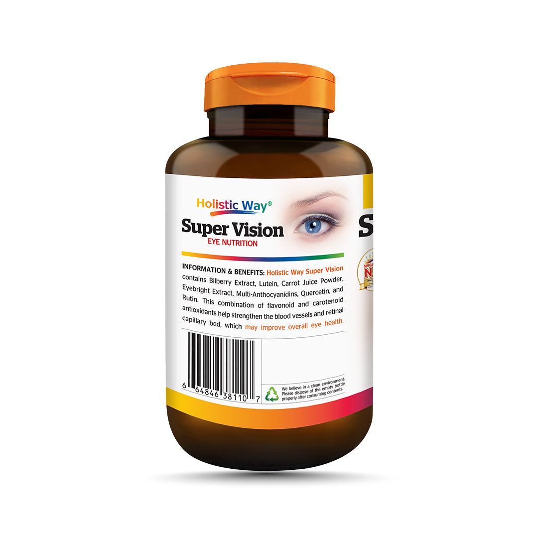 Holistic Way Super Vision is a specially formulated dietary supplement that contains a range of ingredients to support and enhance general eye health. These include Bilberry Extract, Lutein, Carrot Juice Powder, Eyebright Extract, Multi-Anthocyanidins, Quercetin, and Rutin. The combination of flavonoid and carotenoid antioxidants in this formulation work together to help strengthen the blood vessels and retinal capillary bed, which may improve overall eye health. This product is an excellent source of nutrients for those looking to support their vision and maintain good eye health.
