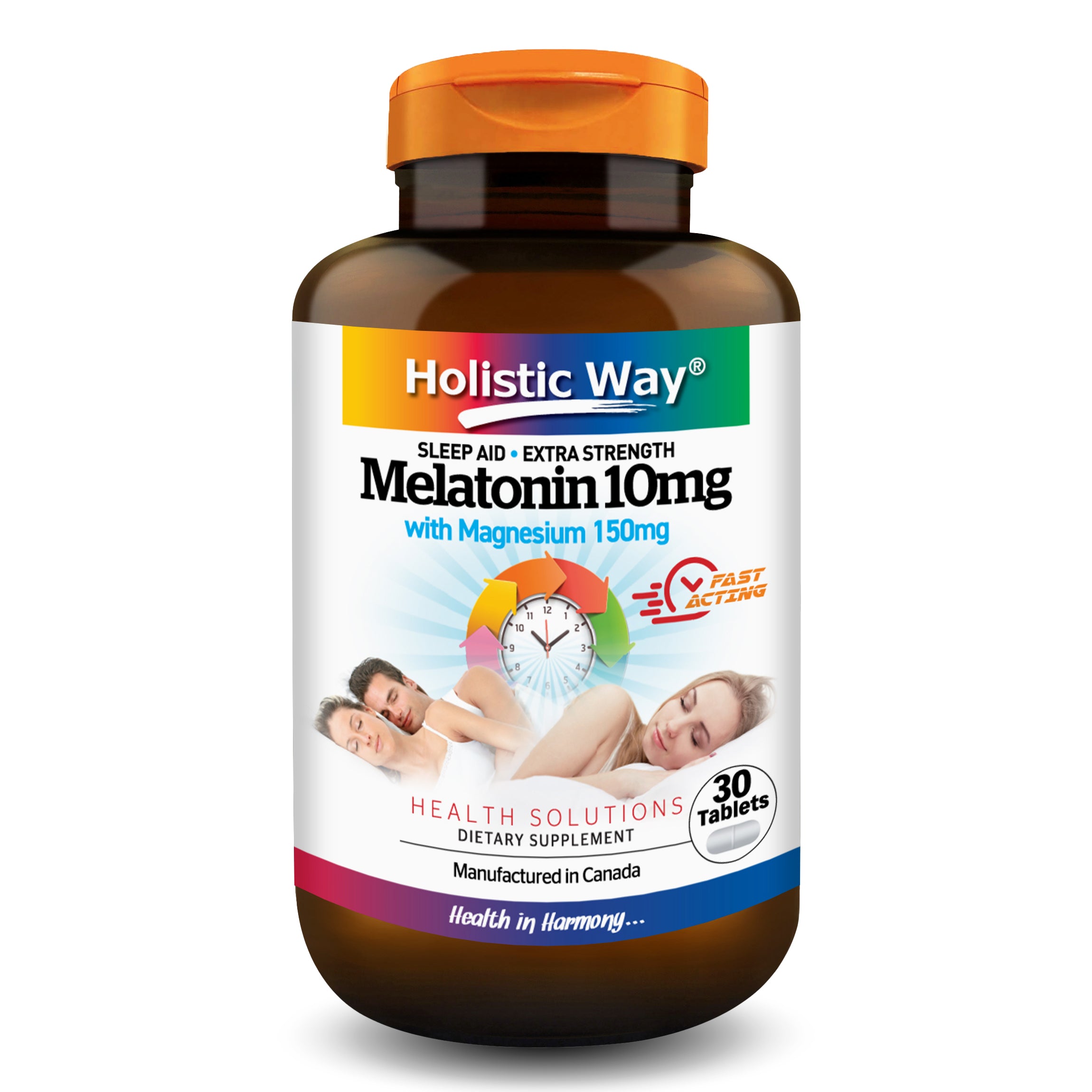 Holistic Way Extra Strength Melatonin 10mg with Magnesium 150mg is a powerful sleep aid that can help improve sleep quality for those struggling with sleep problems. This fast-acting tablet does not require sublingual administration, allowing for best possible absorption and quick results. In addition to melatonin, this formulation is also enriched with 150mg of elemental magnesium to support healthy muscle function and encourage relaxation. Together, melatonin and magnesium work synergistically to promote and support sound sleep.