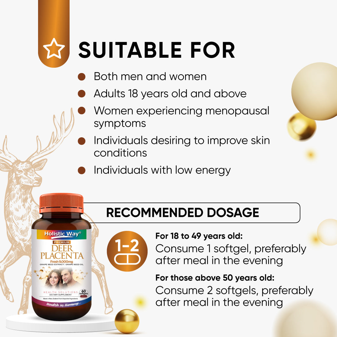 Holistic Way Premium Deer Placenta Fresh 9000mg is suitable for both men and women who wish to support youthfulness, vitality, and enhance general well-being.