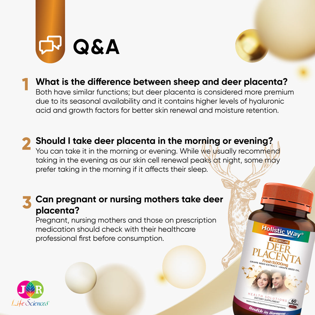 - Rich in protein, amino acids, hyaluronic acids, vitamins and minerals, deer placenta may deliver necessary nutrients required by the skin