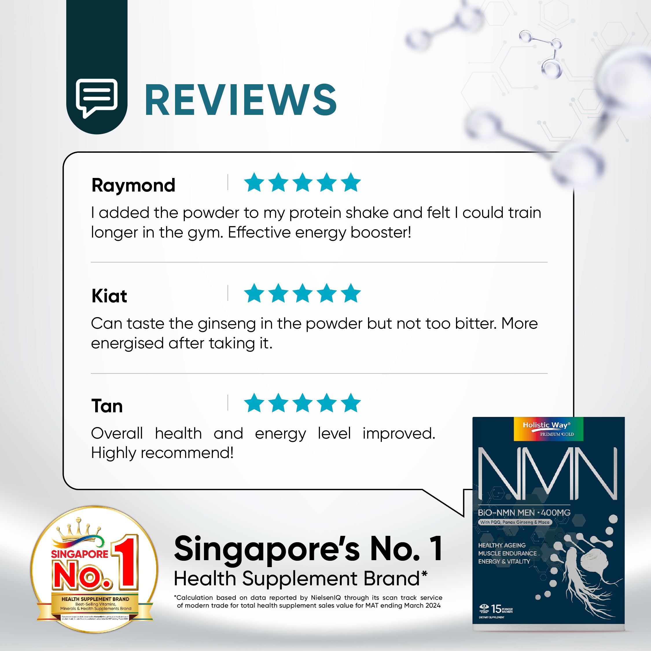 NAD+, a cellular energiser, declines with age, making our bodies more susceptible to environmental stress. Holistic Way Bio-NMN Men 400mg increases NAD+ levels in the body and supports healthy cells and ageing. Enhanced with patented Beta-alanine, it can support muscle endurance and delay fatigue. PQQ, Panax Ginseng and Maca Extracts are also included to improve stamina, mental clarity, and work capacity. Experience renewed vitality and overall well-being with Holistic Way Bio-NMN Men.