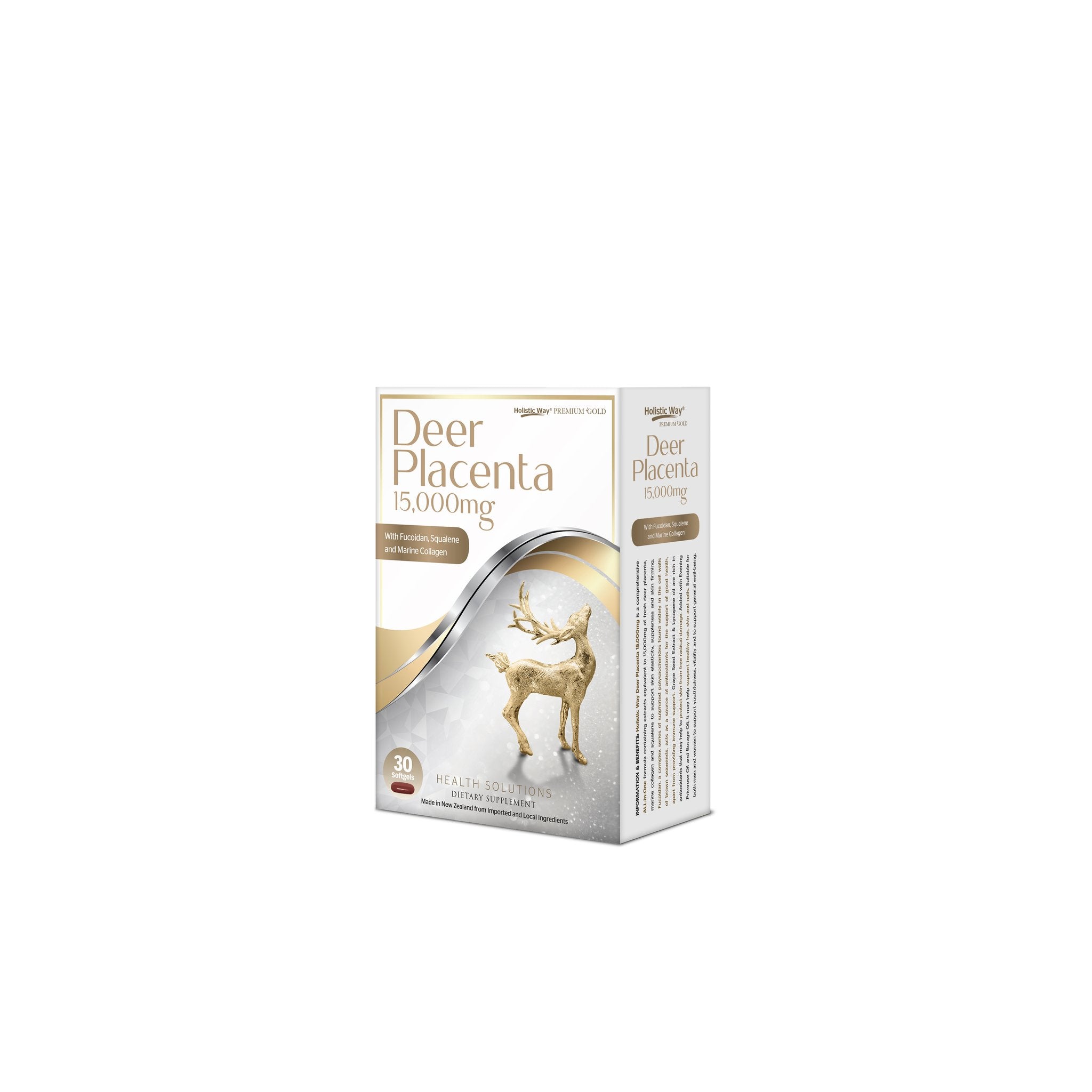 Holistic Way Premium Gold Deer Placenta 15,000mg is a comprehensive ALL-in-One formula containing extracts equivalent to 15,000mg of fresh deer placenta, marine collagen and squalene to support skin elasticity, suppleness and skin firming.