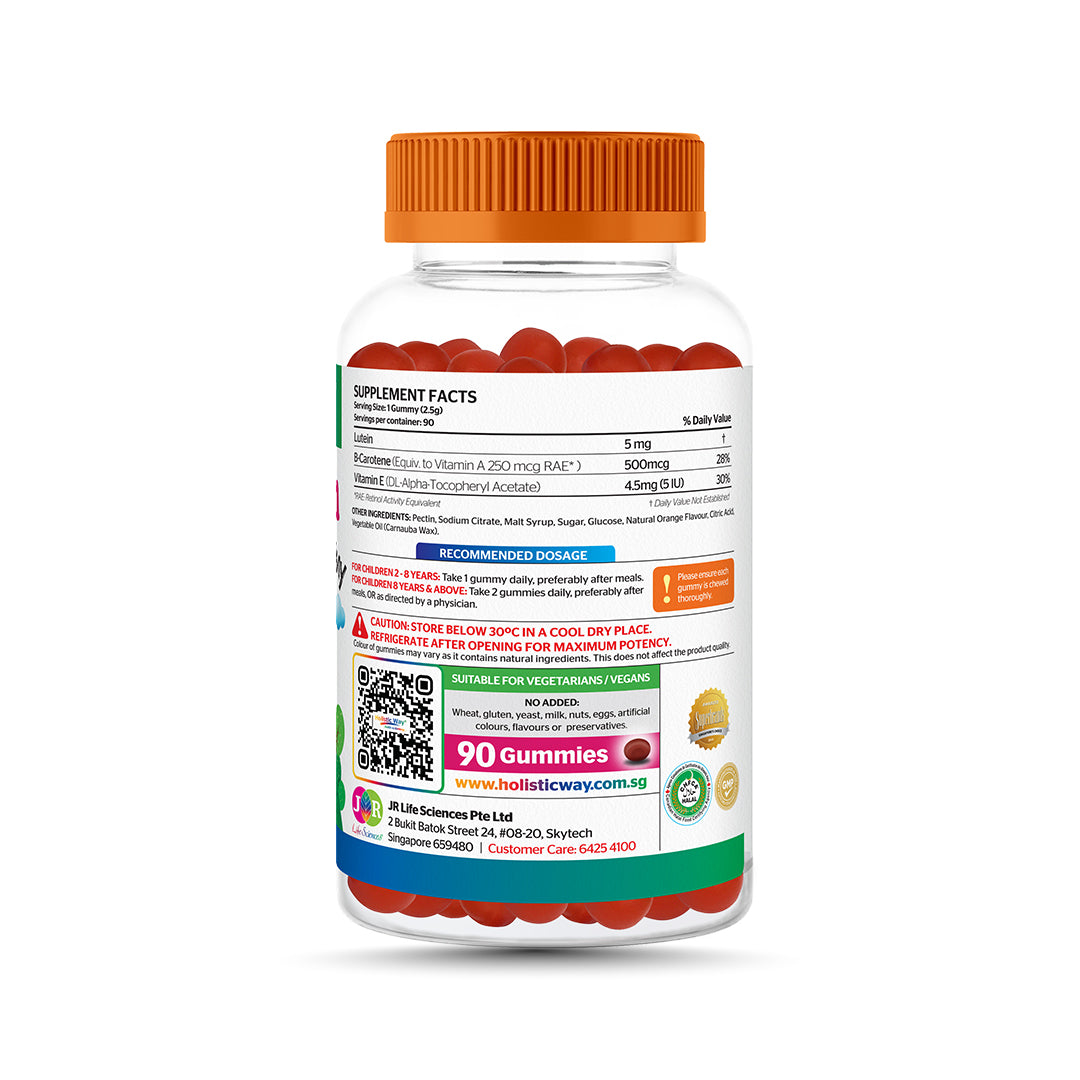Holistic Way 儿童叶黄素软糖或有助于支持儿童的健康视力。 叶黄素是有效的抗氧化 剂,有助于过滤有害的蓝光。 添加了 β-胡萝卜素,它可以在我们体内转化为维生素 A, 并支持健康的皮肤和眼睛。 维生素 E 也有助于保护我们的眼睛免受自由基的伤害。