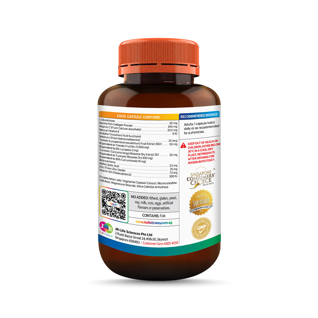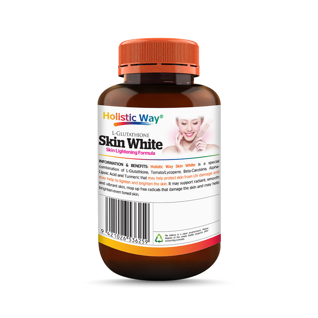 Holistic Way 美白肌肤配方结合了 L-谷胱甘肽,番茄/番茄红素,贝塔胡萝卜素,阿尔 法硫辛酸和黄姜,有助于保护肌肤免受紫外线的伤害,从而保持白皙细嫩的肌肤。此 配方也助于清除自由基,从而减低其对皮肤的伤害,促进白皙细嫩和光滑的肌肤。
