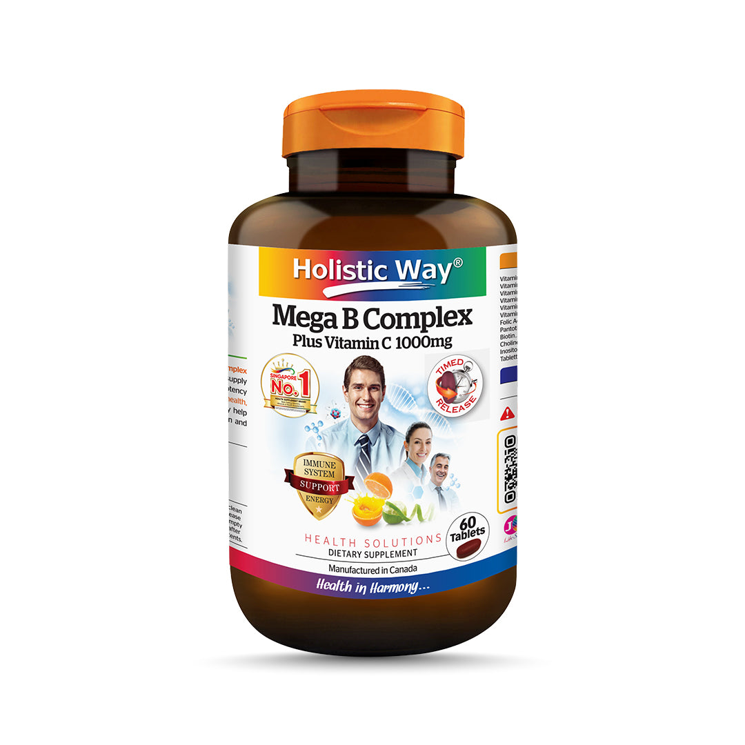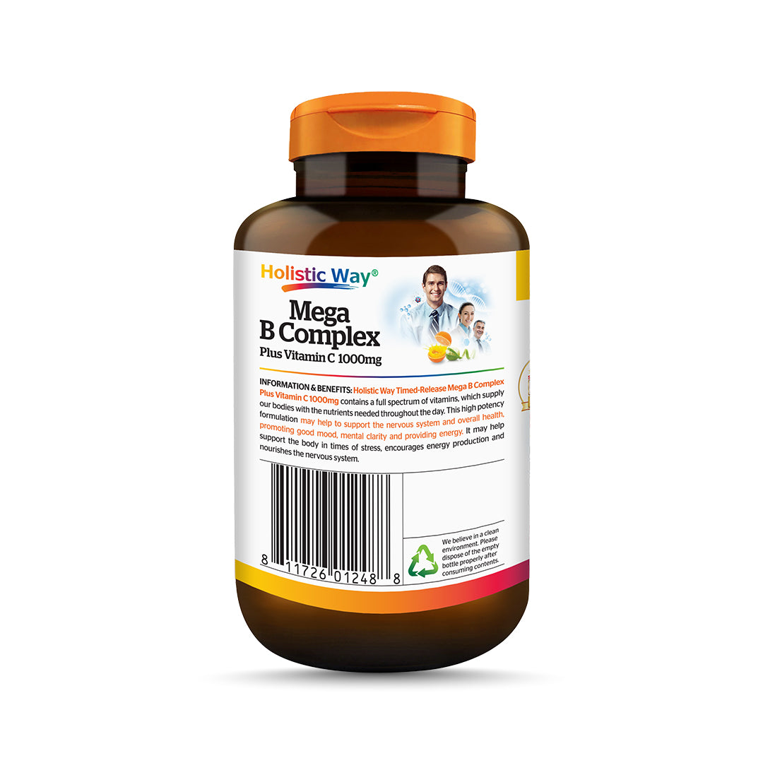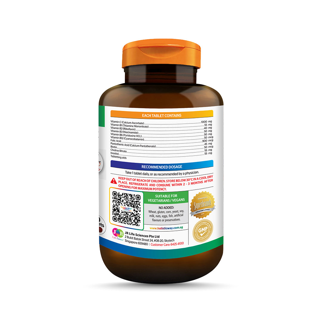 Holistic Way 超级综合维生素 B 与维生素 C 1000 毫克含有全面的维生素 B 群和亦添加了维生 素 C,能够帮助提供一天所需的营养。此产品的高效配方能够帮助维持神经系统和整体健康, 提倡心情愉悦,头脑清晰,并能提供能量。此外,它能帮助舒缓压力,加强能力产生和滋养神 经系统。维生素 B1 和 B2 能帮助碳水化合物转换成能量,新陈代谢脂肪和蛋白质。缺少维生 素 B3 会造成消化不良,而维生素 B6 能分解蛋白质。蛋白质越多,您所需的 B6 就越多。至于 生物素(B7),它是酵素成分并能用于消化。维生素 C 能帮助铁质的吸收。