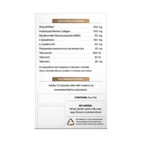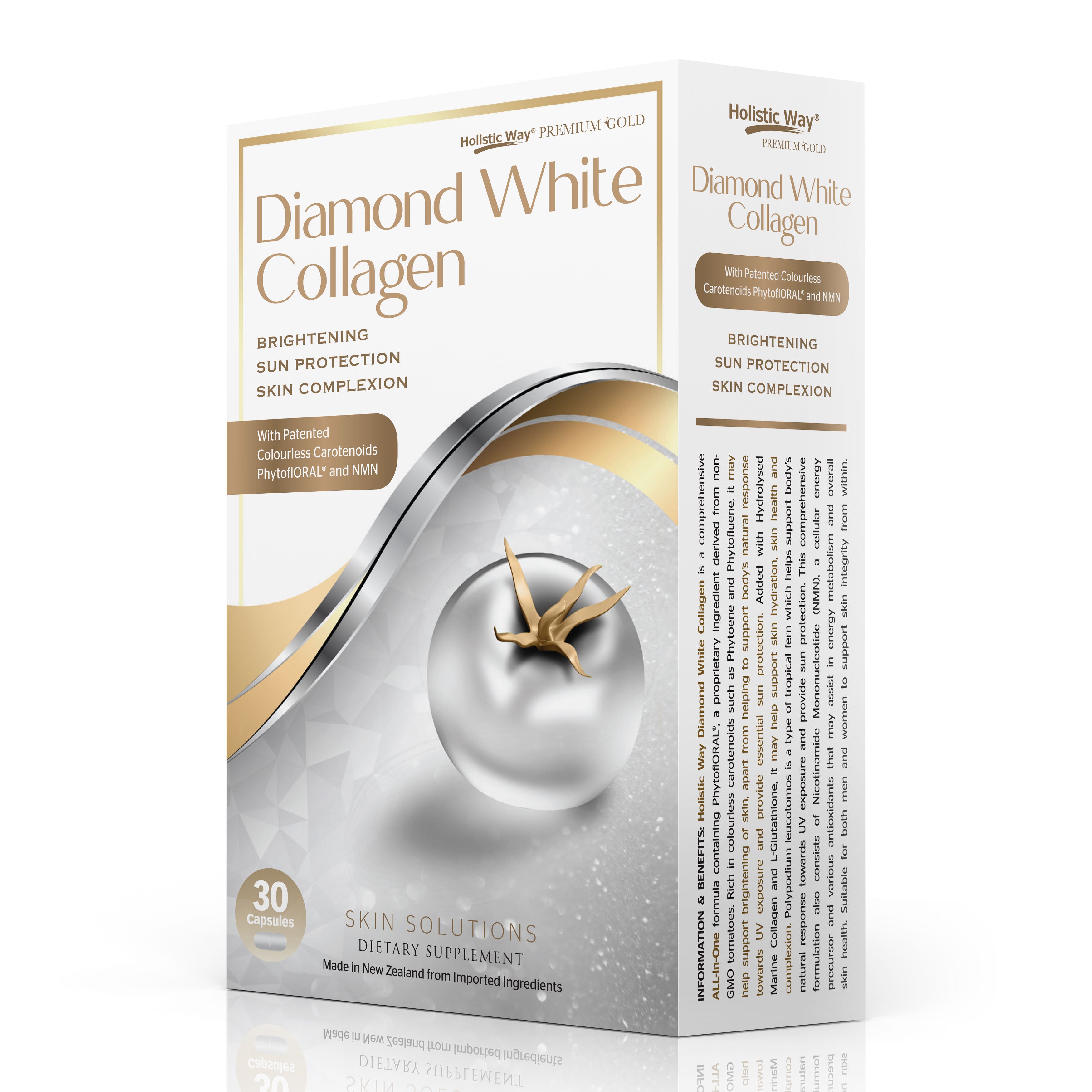产品简介 Holistic Way Premium Gold 美白胶原蛋白是个全方位的配方,含有 PhytoflORAL®,一 种源自非改造基因番茄的专有成分。富含胡萝卜素,如八氢番茄红素和四氢番茄红素, 除了有助于支持身体对紫外线照射的自然反应和提供必要的防晒保护外,还有助于提 亮皮肤。添加了水解海洋胶原蛋白和 L-谷胱甘肽,或有助于支持皮肤保湿、皮肤健康 和肤色。 Polypodium leucotomos 是一种外敷蕨类植物,有助于支持身体对紫外线照 射的自然反应并提供必要的防晒保护。综合配方还包括烟酰胺单核苷酸(NMN),一种 细胞能量前体和各种抗氧化剂,或有助于能量代谢和整体皮肤健康。适合男性和女性, 由内支持皮肤完整性。